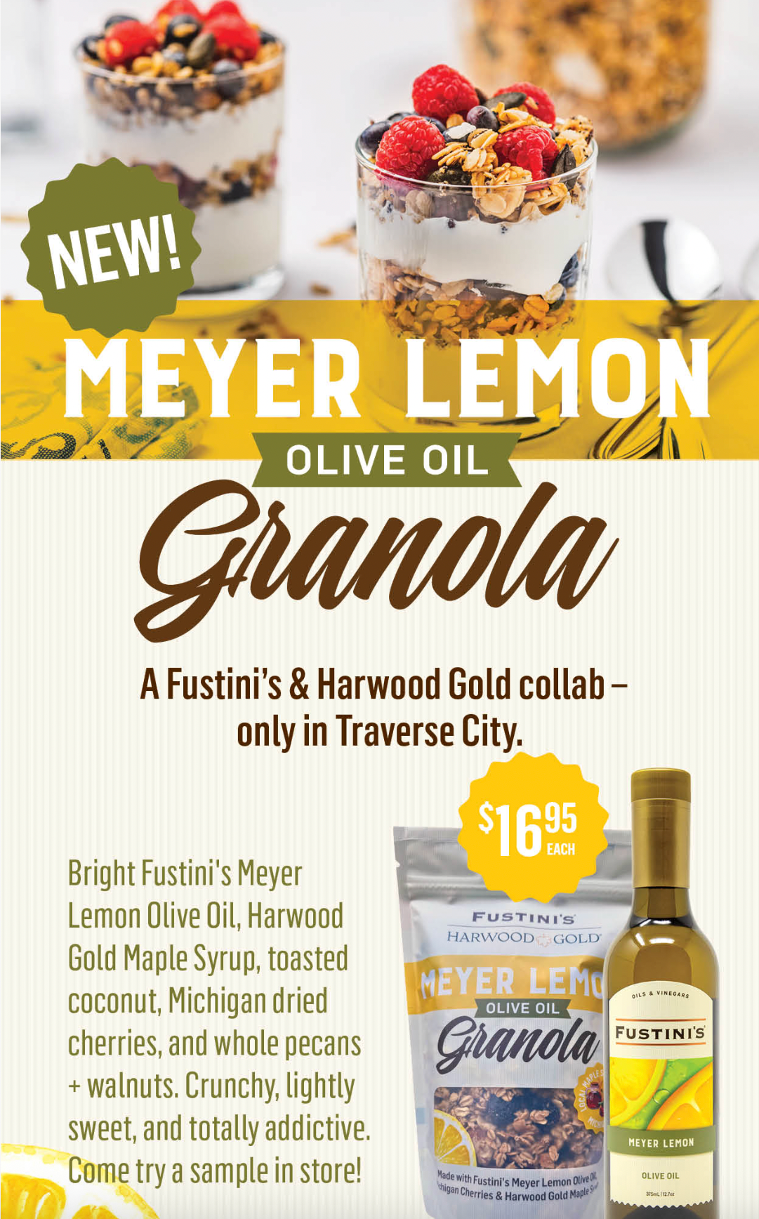 Lead concept development and producer partnership for Meyer Lemon Olive Oil Granola with Harwood Gold, featuring Fustini’s best-selling Meyer Lemon olive oil.